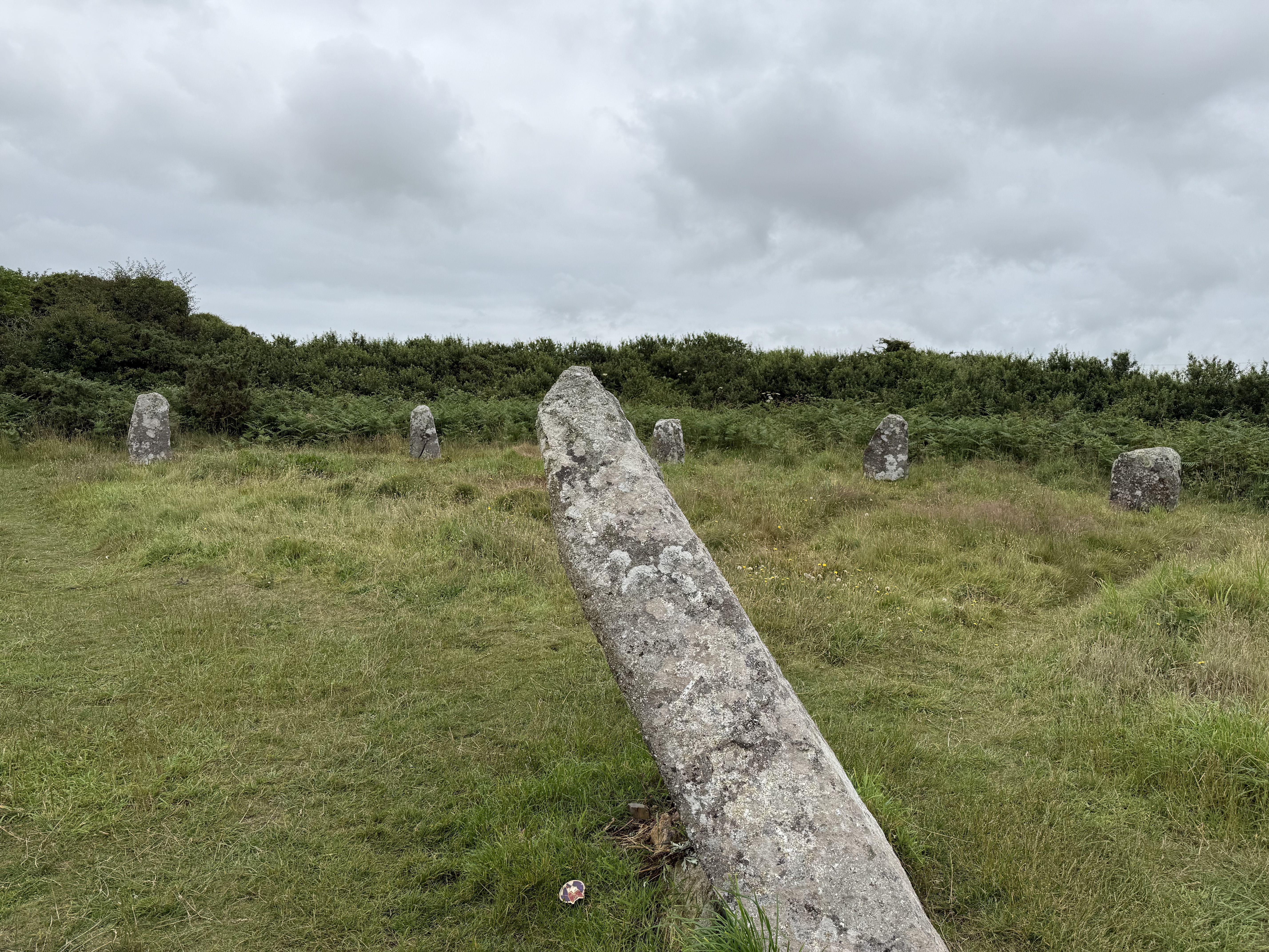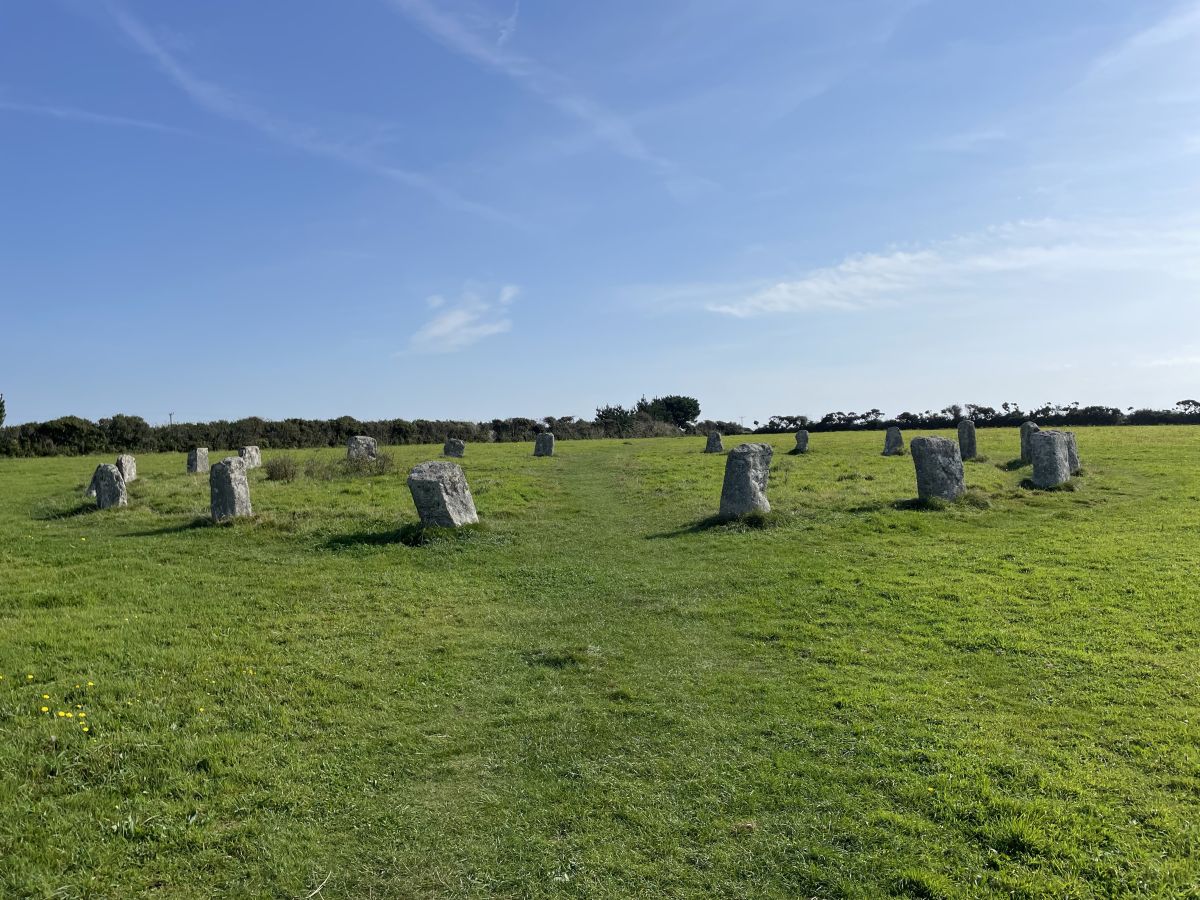 Boscawen-Un is a very atmospheric stone circle to visit. It can be located by parking in a nearby lay-by and then taking a 10 minute walk along a path through some ferns. The circle is in a field surrounded by hedges and can be gained access to through a gate.